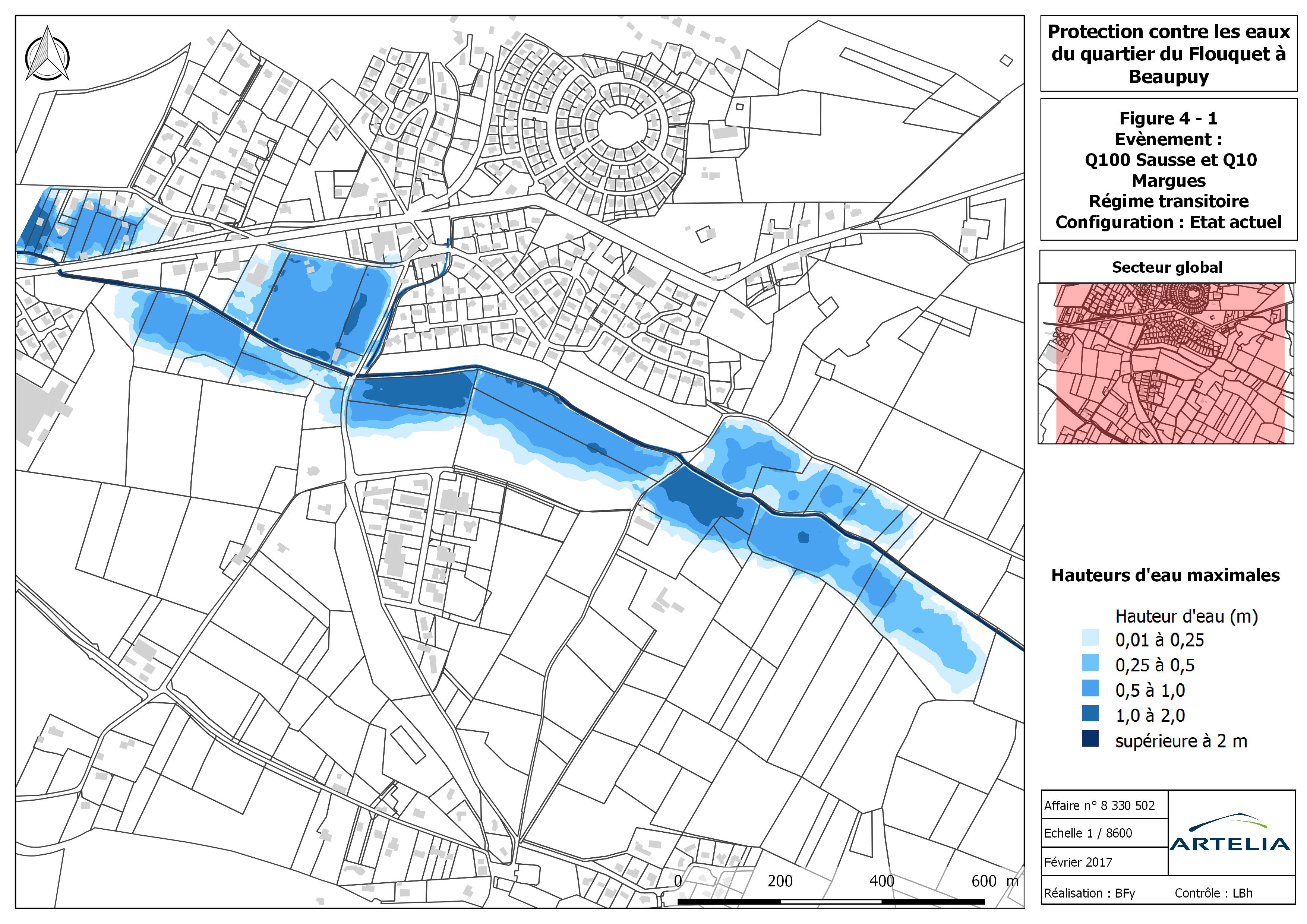 Etudes qui ont permis de définir un projet de protection contre les eaux (inondations et pluvial) du lotissement du Flouquet sur la commune de Beaupuy. Existence d’un système d’endiguement en rive droite de la Sausse assurant la protection du lotissement – problématiques d’érosion en pied de digue et d’incision du lit du cours d’eau. Réseau pluvial redéfini à l’arrière des endiguements.