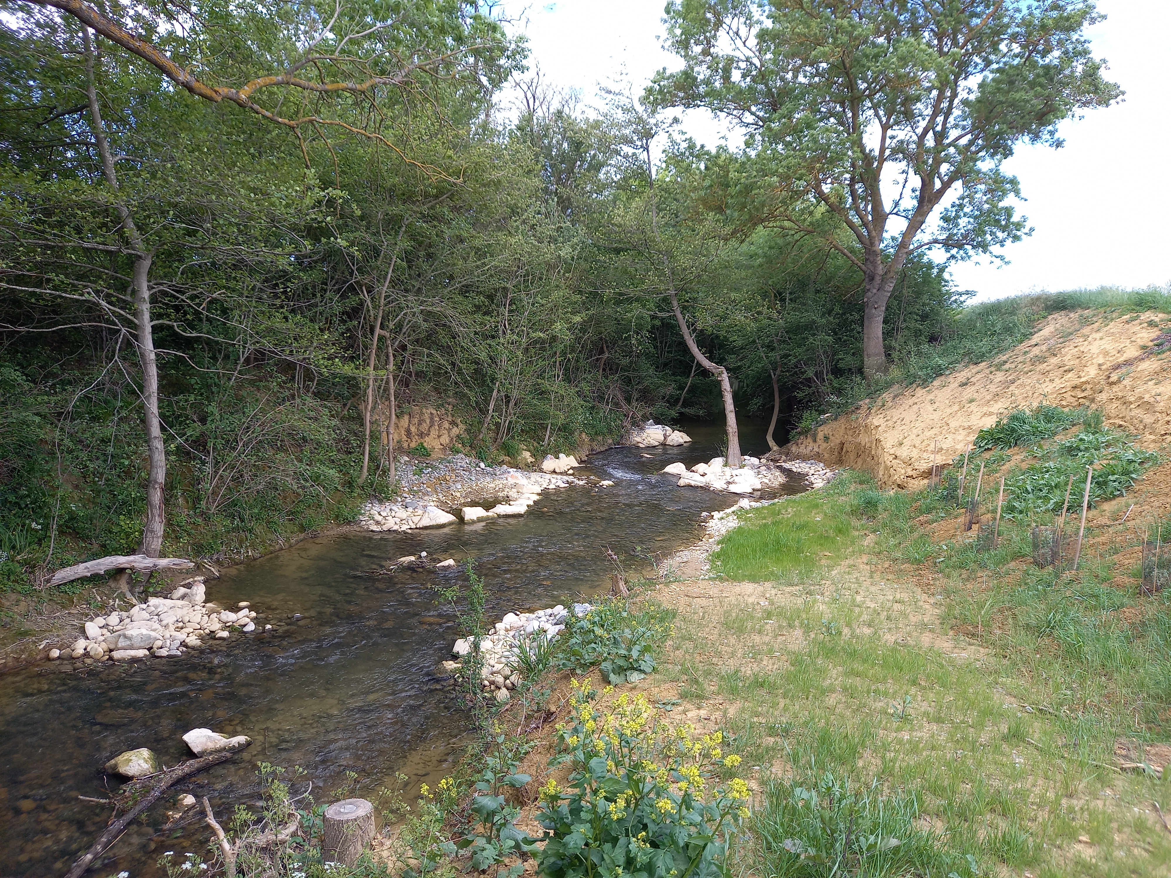 En 2016, une première tranche de travaux a permis de renaturer 1400m de cours d’eau. Puis en 2019, le SBHG a fait l’acquisition de parcelles, situées en rive droite de l’Hers-Mort au lieu-dit L’Angles à Renneville, permettant la renaturation en 2020 de 730 m de cours d’eau : diversification des écoulements, recharge de matériaux alluvionnaires, ouverture localisée d’un lit moyen, végétalisation, création d’accès au cours d’eau et de cheminements.